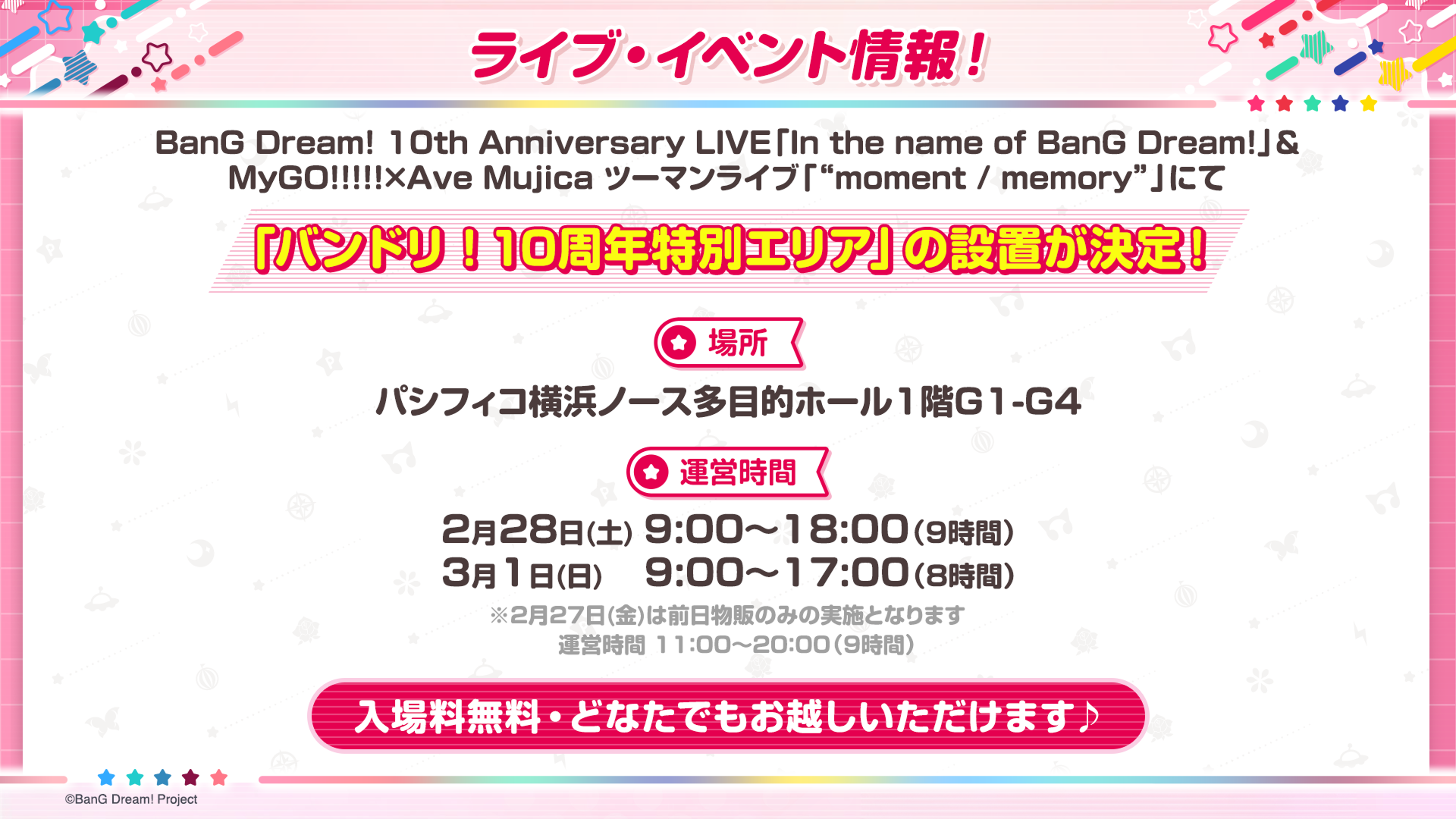 BanG Dream! 10th Anniversary LIVE「In the name of BanG Dream!」からMyGO!!!!!×Ave Mujica ツーマンライブ「“moment / memory”」にかけて、パシフィコ横浜ノースに物販・協賛・TCGなど、各種ブースが集合した特別エリアを設置!