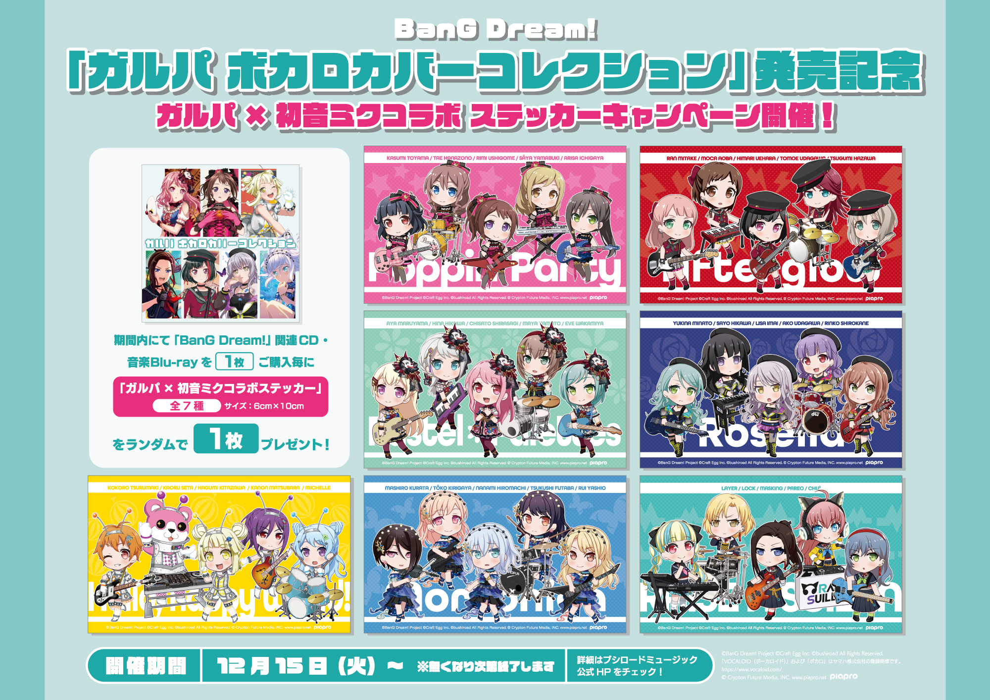 12月15日(火)より、対象店舗にて「BanG Dream!」関連CD・音楽Blu-ray(新譜・旧譜含む)をご購入ごとに、「ガルパ×初音ミクコラボ ステッカー(全7種)」をランダムで1枚プレゼント!