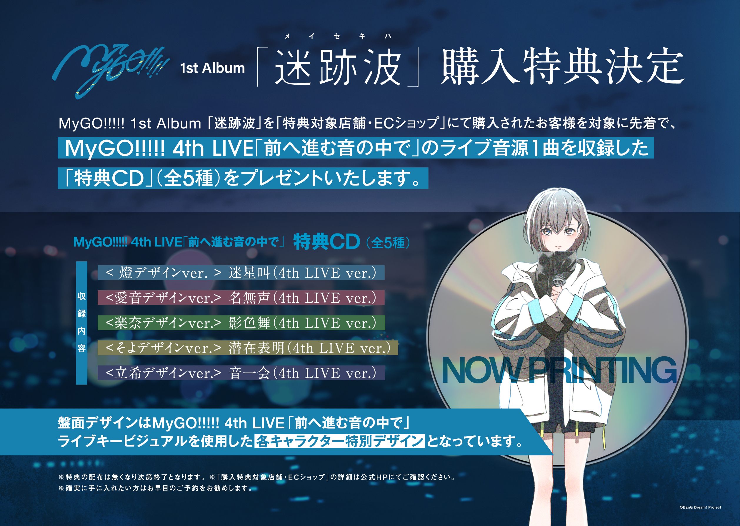MyGO!!!!! 1st Album「迷跡波」を「特典対象店舗・ECショップ」にて購入されたお客様を対象に先着で「特典CD」(全5種)をプレゼント!