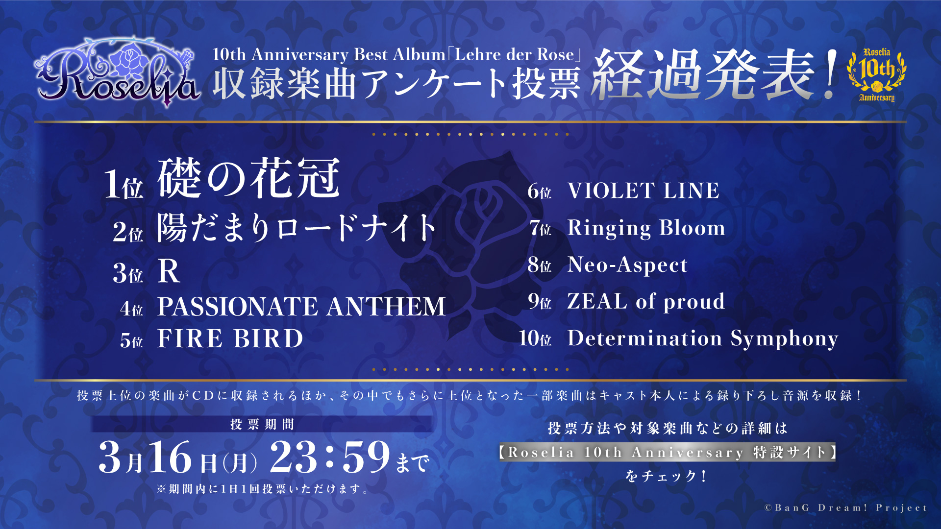 Roselia 10th Anniversary 特設サイトにて、収録楽曲のアンケート投票を受付中です!皆様の投票をお待ちしています♪