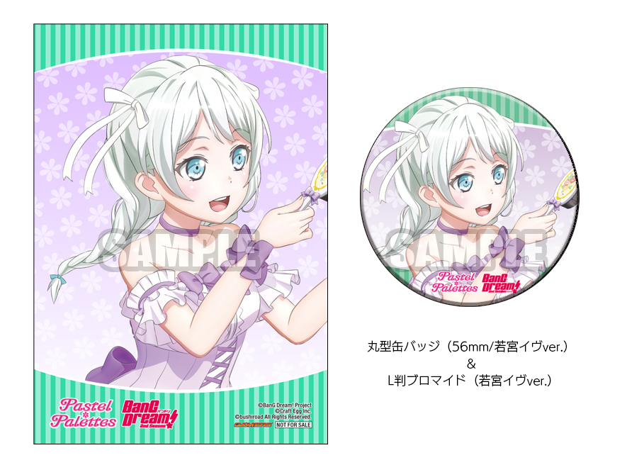 限定盤:丸型缶バッジ(56mm/若宮イヴver.)& L判ブロマイド(若宮イヴver.)