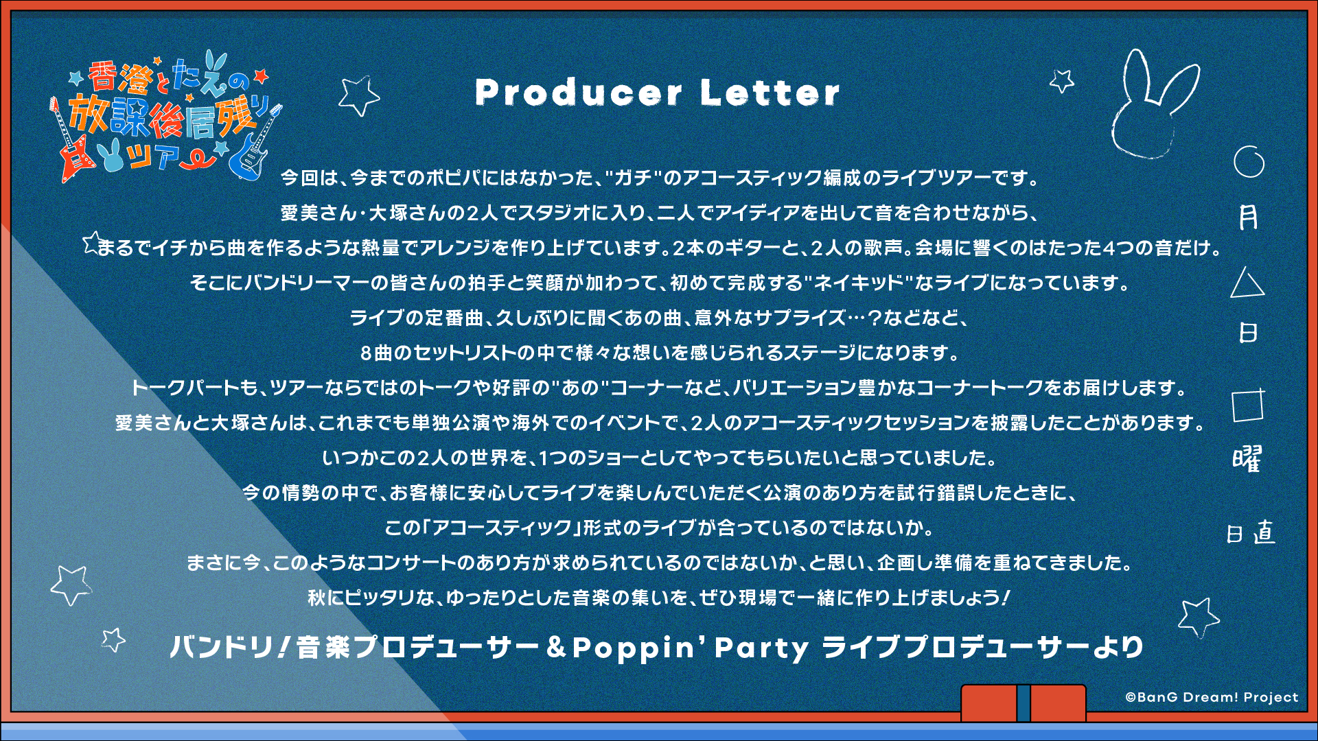 Poppin'Partyから、Gt.&Vo. 愛美(戸山香澄役)& Gt. 大塚紗英(花園たえ役)によるアコースティックライブツアーの開催が決定!