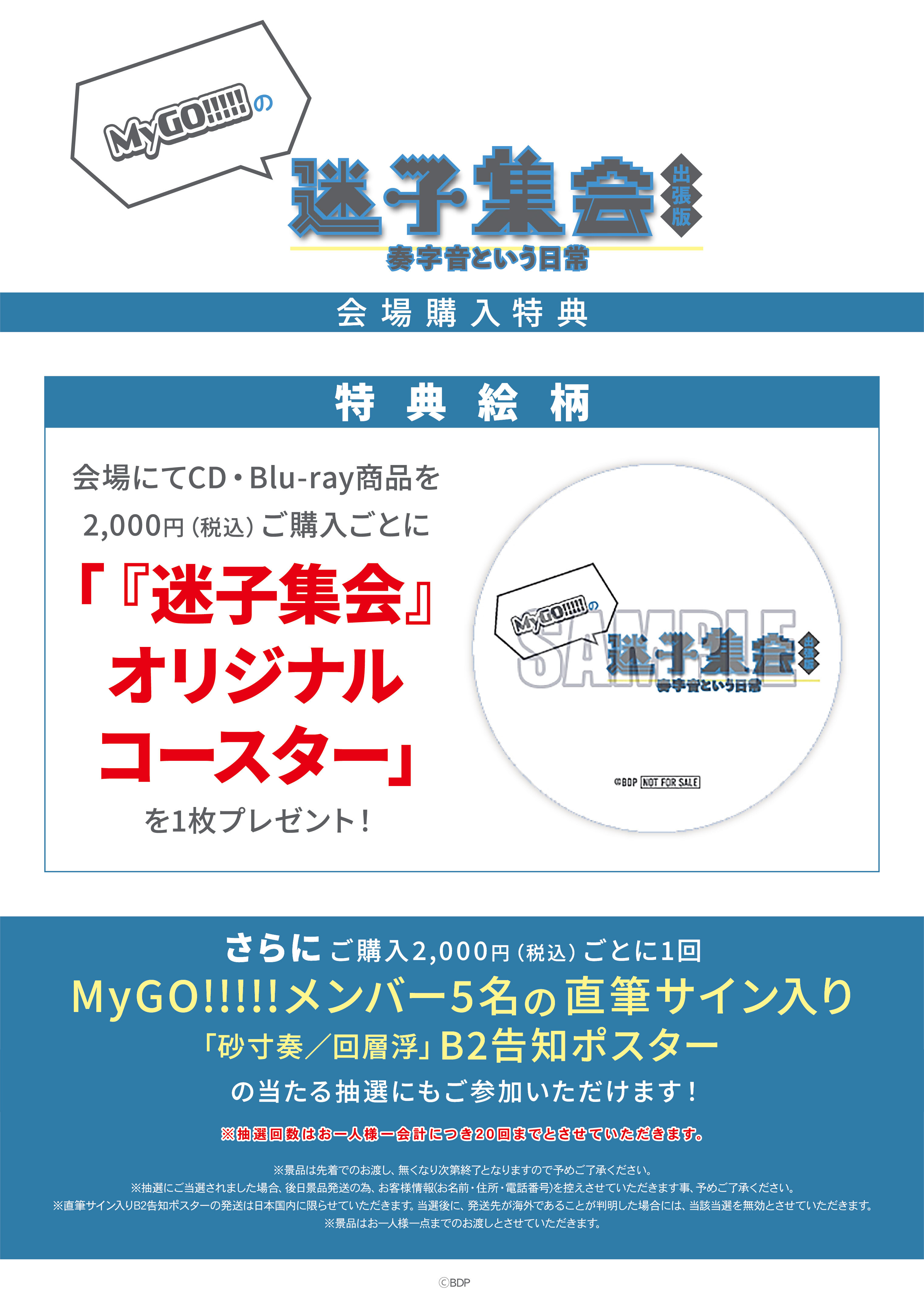 会場にて対象商品(CD,Blu-ray商品)を2,000円(税込)ご購入ごとに、「『迷子集会』オリジナルコースター」を1枚プレゼントいたします。