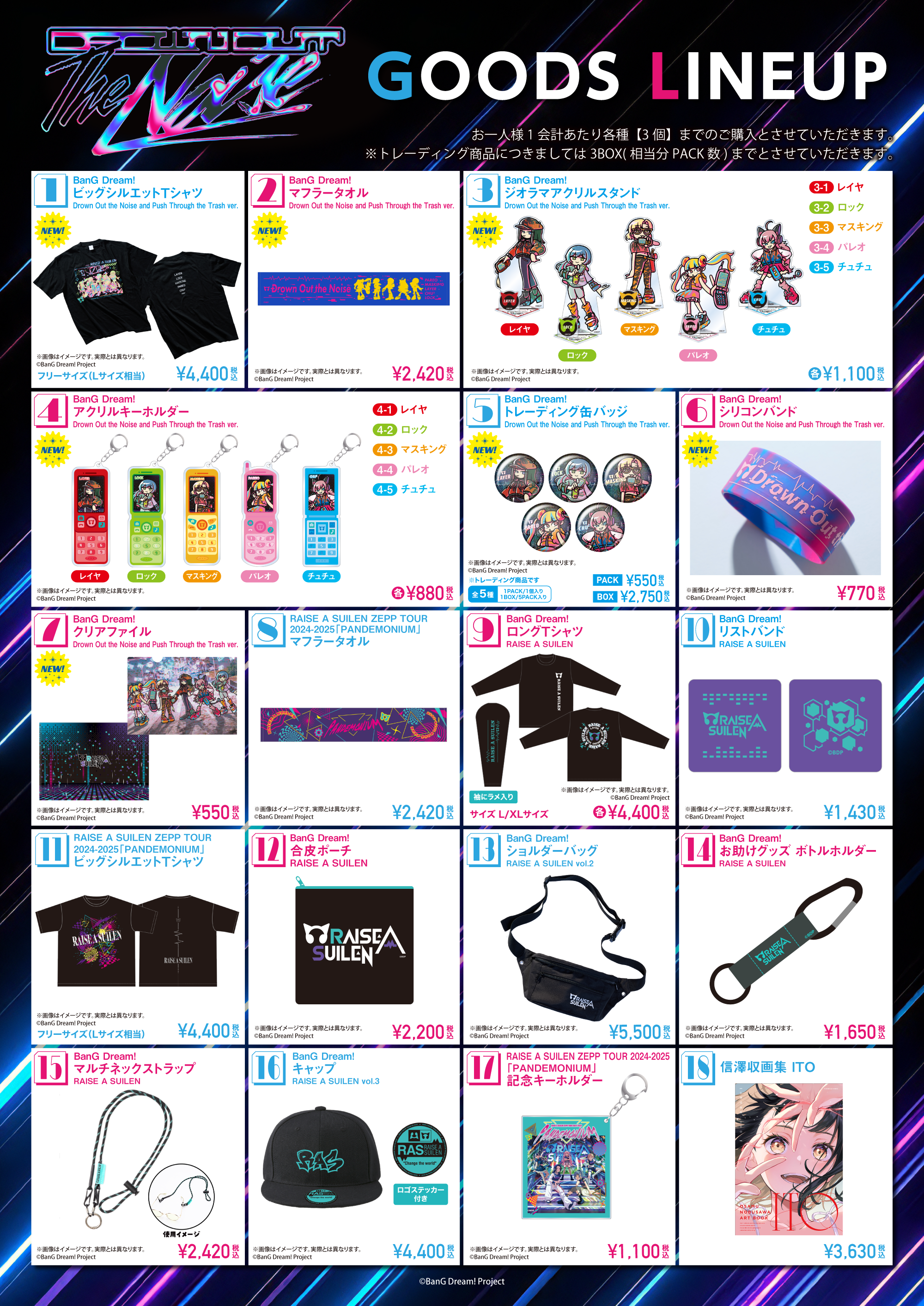 ※抽選会でご当選された場合に関しても、「RAISE A SUILEN『Drown Out the Noise』ミニフォトサイズカード(全5種)」は対象商品2,000円(税込)ご購入ごとに1枚をお渡しさせていただきます。