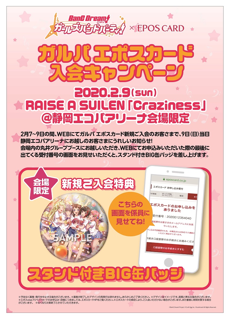 また2月7日(金)~9日(日)PM5:00(ライブ開演前)までにエポスカードHPより「バンドリ! ガールズバンドパーティ! エポスカード」を新規お申込いただいたお客さまにも、当日会場内当ブースにて「スタンド付きBIG缶バッチ」を差し上げます。