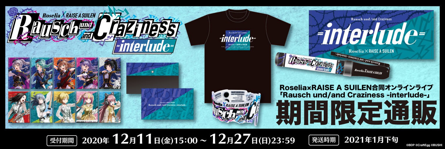 Roselia×RAISE A SUILEN合同オンラインライブ「Rausch und/and Craziness -interlude-」のグッズを期間限定通販いたします。