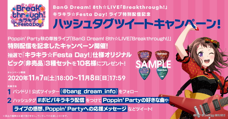 2020年10月8日東京ガーデンシアターにて開催したPoppin'Party秋の単独ライブ「BanG Dream! 8th☆LIVE『Breakthrough!』キラキラ☆Festa Day!」のライブ特別配信を記念したTwitterキャンペーン開催決定!
