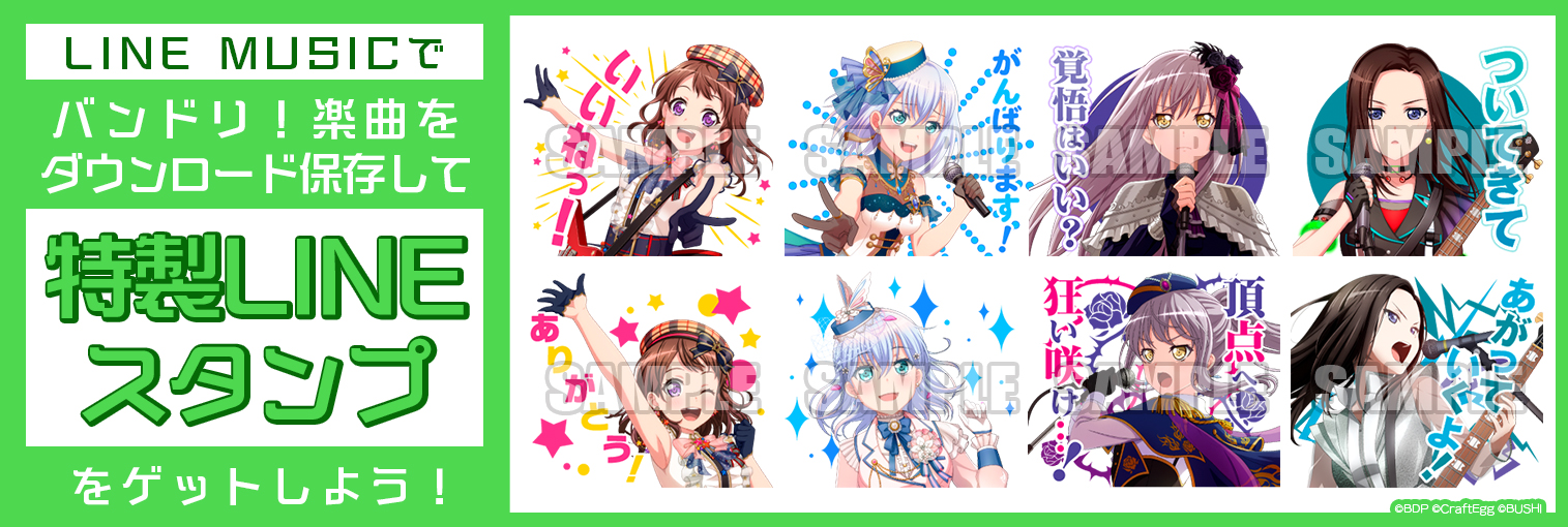 2021年1月にリリースされるバンドリ! シングル4タイトルをまとめたLINE MUSICのプレイリスト「バンドリ!1月シングルまとめ」 収録曲をダウンロード保存した方全員に、 特製LINEスタンプをプレゼントいたします!