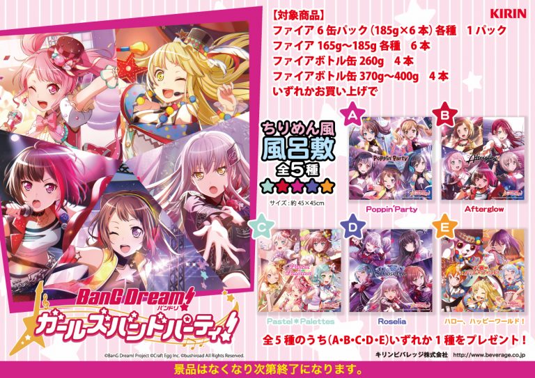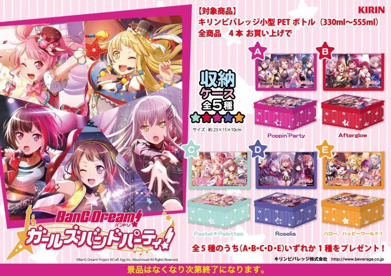 対象商品をお買い上げいただいたお客さまに「バンドリ! ガールズバンドパーティ!」オリジナル収納ケース全5種、または、オリジナルちりめん風 風呂敷全5種のうちいずれか1種をプレゼントします!