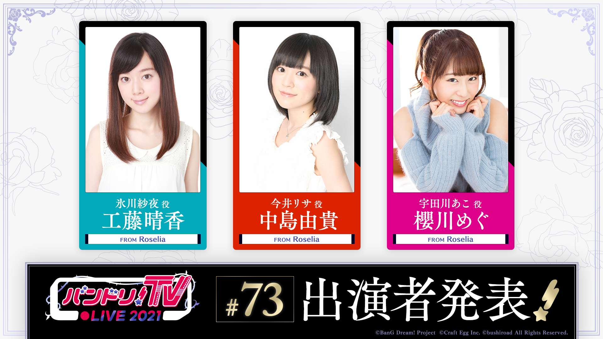 「バンドリ!TV LIVE 2021」はアニメやゲームに出演しているキャストにより、バンドリ!プロジェクトの最新情報などをお届けする生配信番組です!