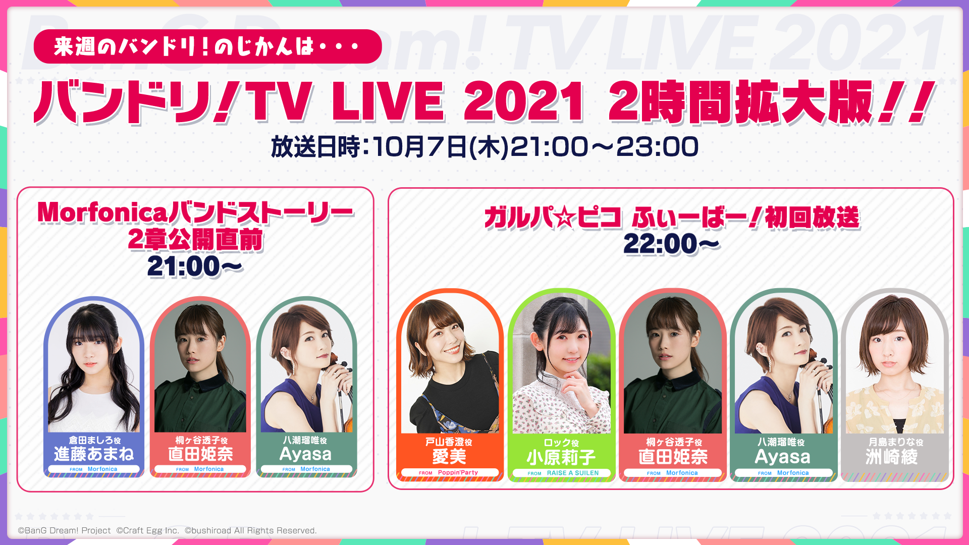 「バンドリ!TV LIVE 2021」はアニメやゲームに出演しているキャストにより、バンドリ!プロジェクトの最新情報などをお届けする生配信番組です!