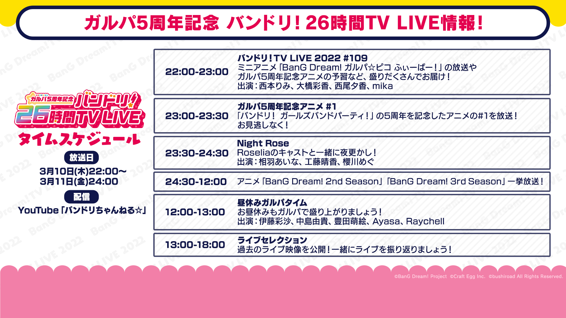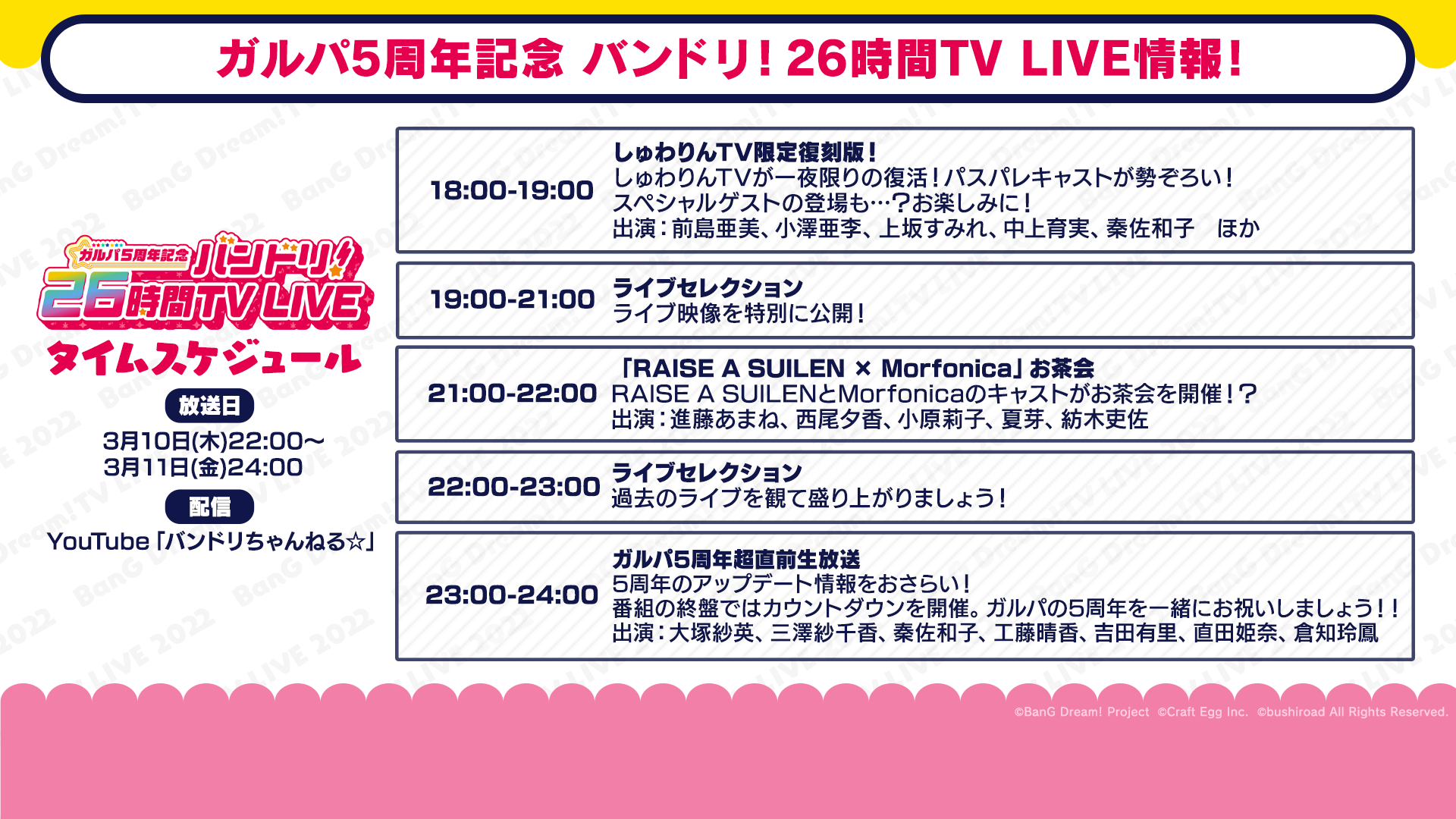 ガルパの5周年を記念し、「ガルパ5周年記念 バンドリ!26時間TV LIVE」を放送いたします!
