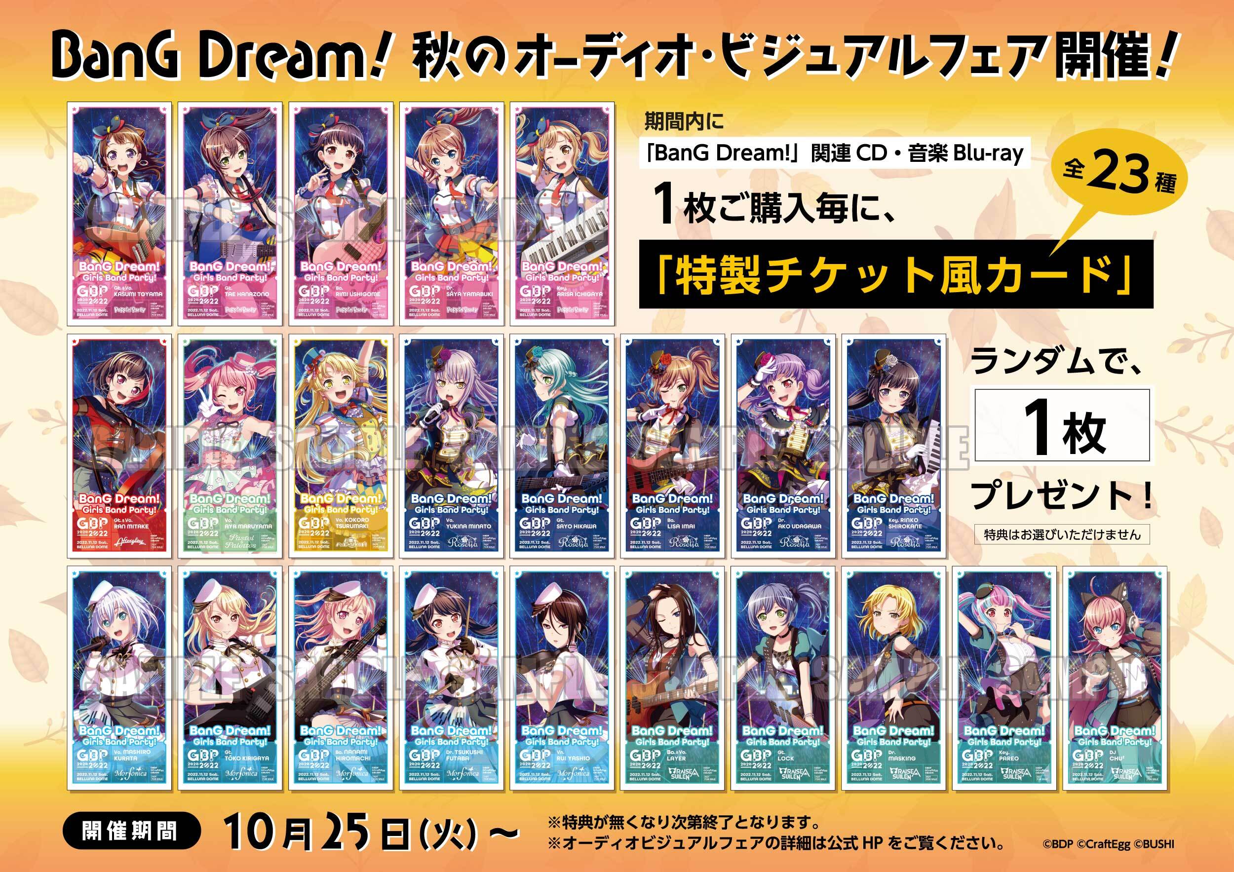 10月25日(火)より、フェア開催対象店舗にて「BanG Dream!」関連CD・音楽Blu-ray(新譜・旧譜含む)を1点ご購入毎に、「特製チケット風カード」(全23種)の中からランダムで1枚をプレゼント!