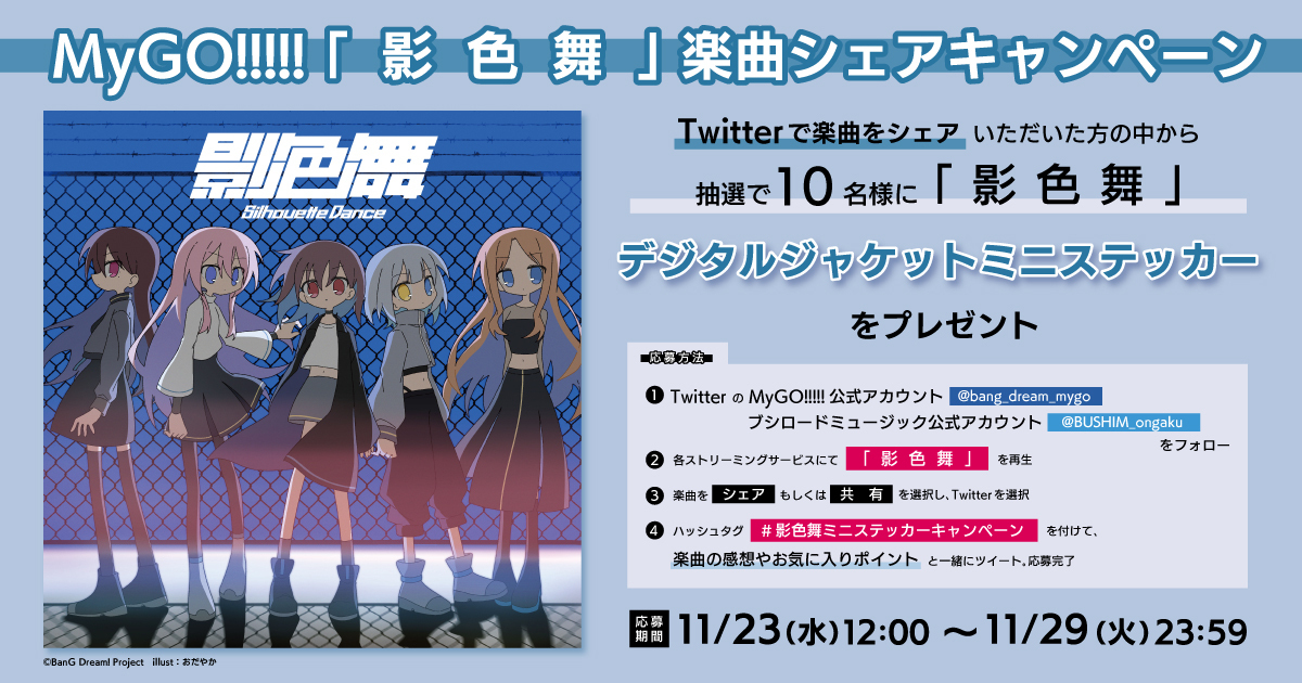 「#影色舞ミニステッカーキャンペーン」を付けて、楽曲の感想をツイートいただいた方の中から、抽選で10名様に「影色舞」デジタルジャケットミニステッカーをプレゼントいたします。
