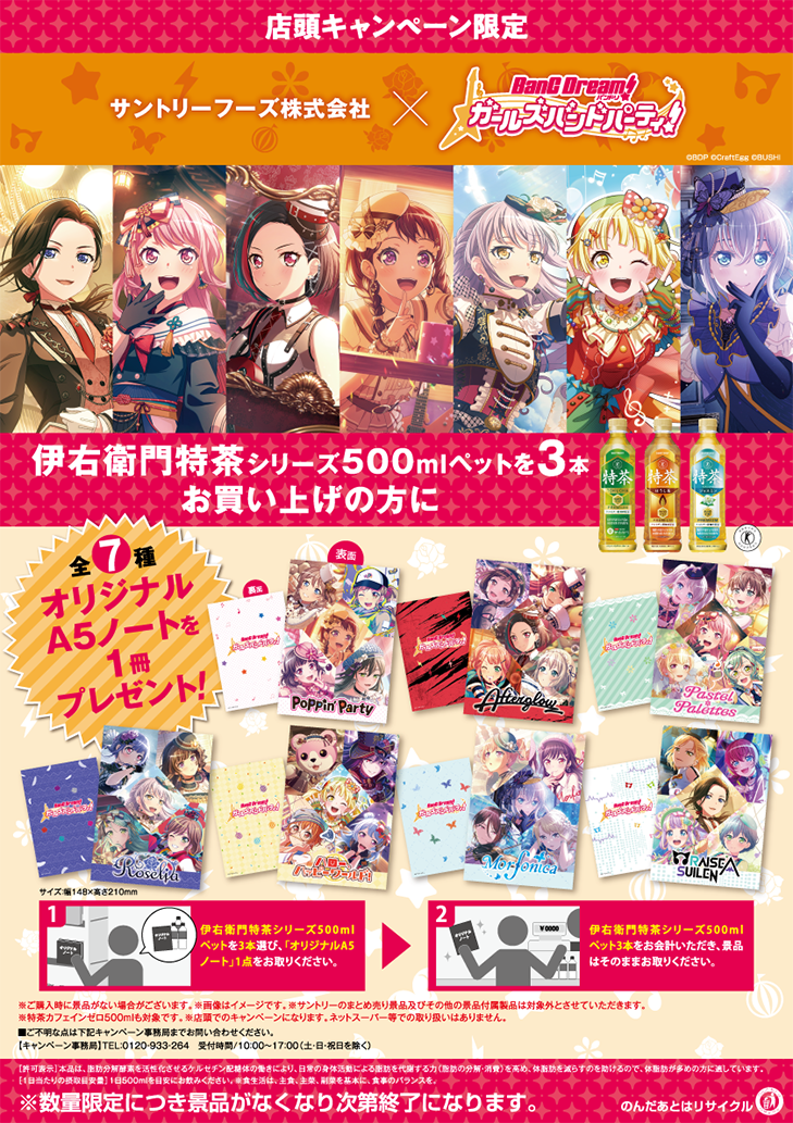 2月21日(火)より、全国の総合スーパー「イオン」(沖縄除く)で、 サントリー伊右衛門特茶シリーズ500mlペット飲料を3本お買い上げの方に、キャンペーン限定「バンドリ!ガールズバンドパーティー!」オリジナルA5ノートを1冊プレゼント致します!デザインは全7種となります。