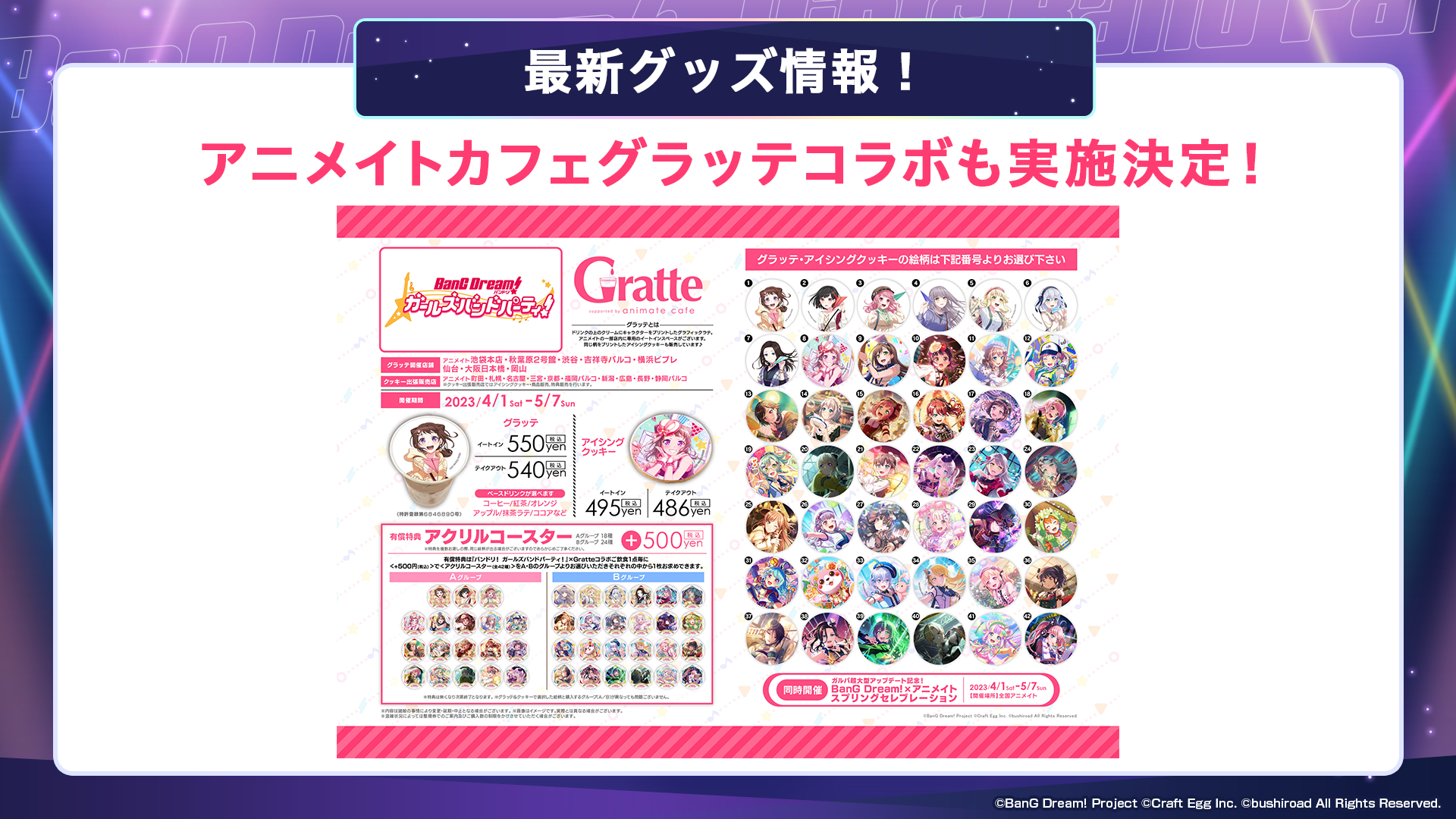 『バンドリ! ガールズバンドパーティ!』×Gratteコラボご飲食1点ごとに、【+500円(税込)】で「アクリルコースター(全42種)」A・Bグループのどちらかをお選びいただき、