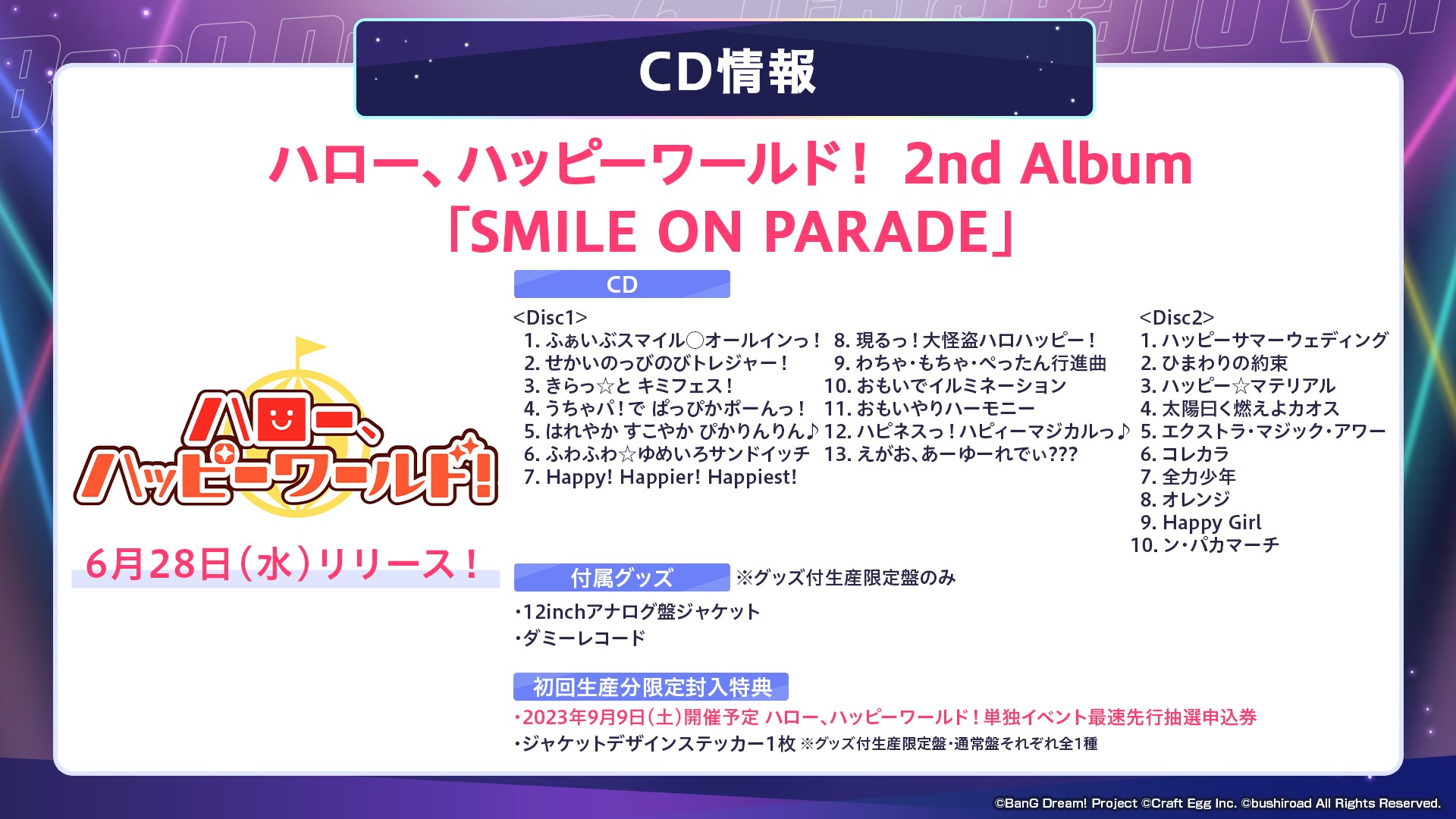 ※チケット最速先行抽選申込券は、2023年6月28日(水)リリースのハロー、ハッピーワールド!2nd Album「SMILE ON PARADE」に封入。