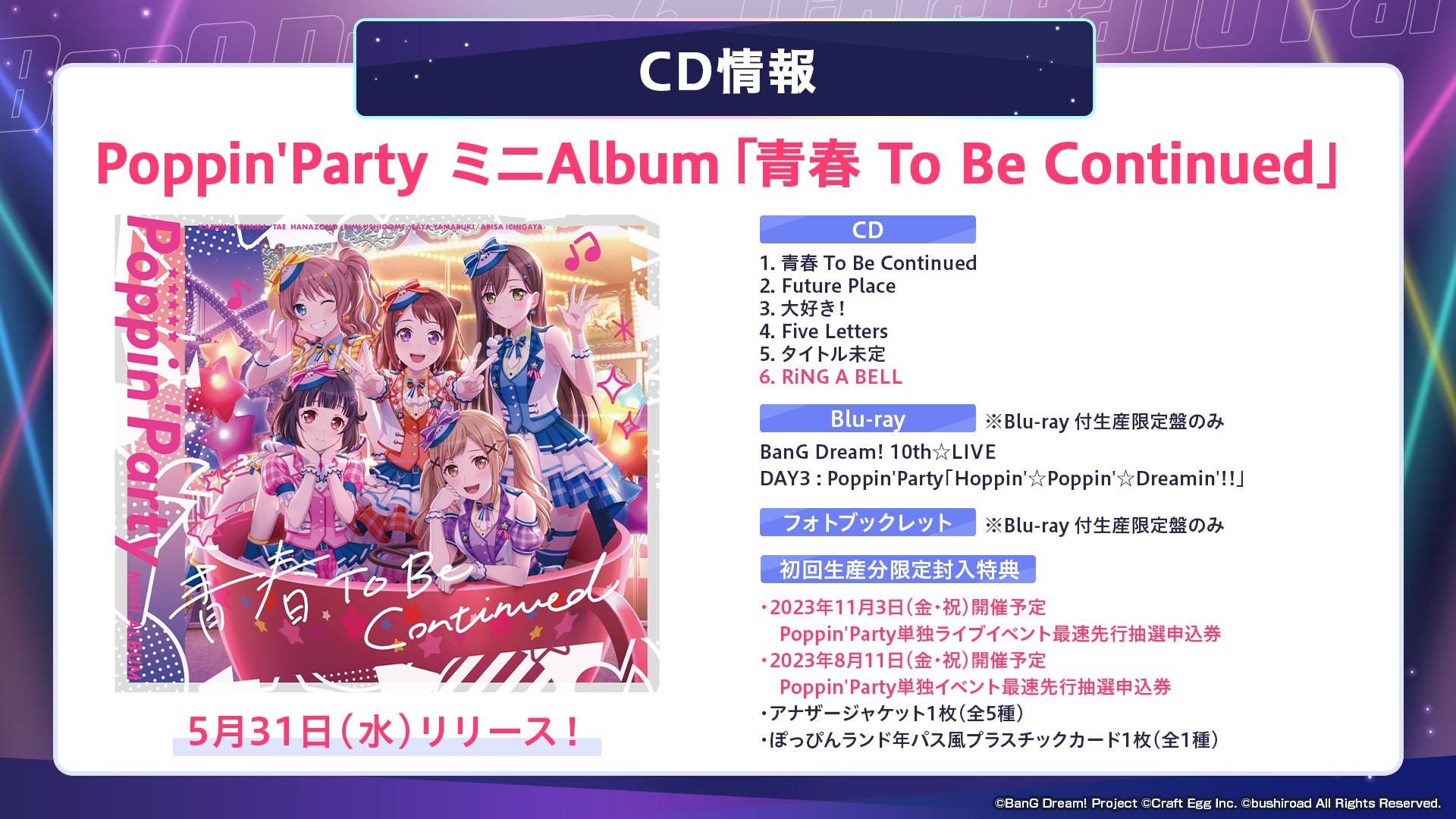 ※チケット最速先行抽選申込券は、2023年5月31日(水)リリース Poppin’PartyミニAlbum「青春 To Be Continued」に封入。