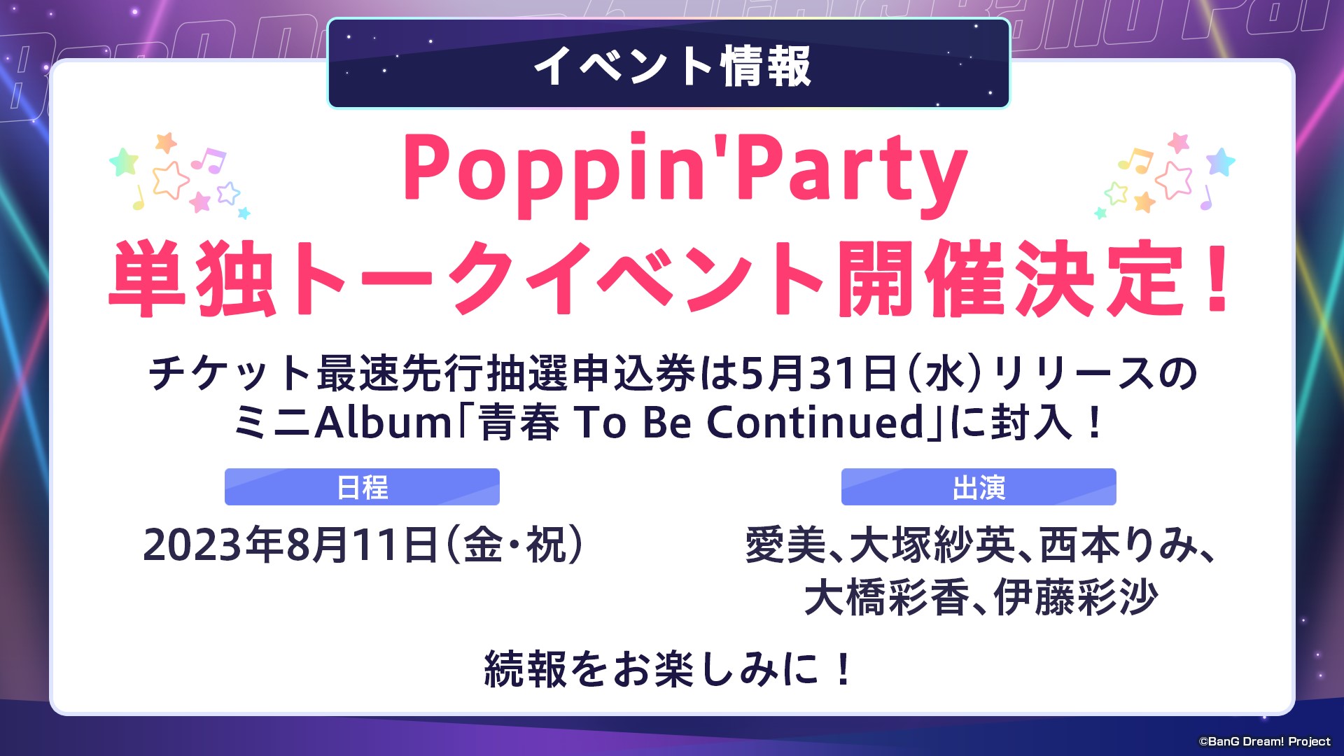 2023年8月11日(金・祝)に、Poppin'Partyによる単独トークイベントの開催が決定!