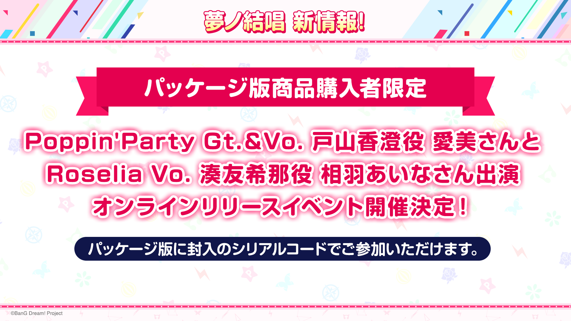 Poppin'Party Gt.&Vo. 戸山香澄役 愛美さんとRoselia Vo. 湊友希那役 相羽あいなさん出演予定のオンラインリリースイベントを開催!