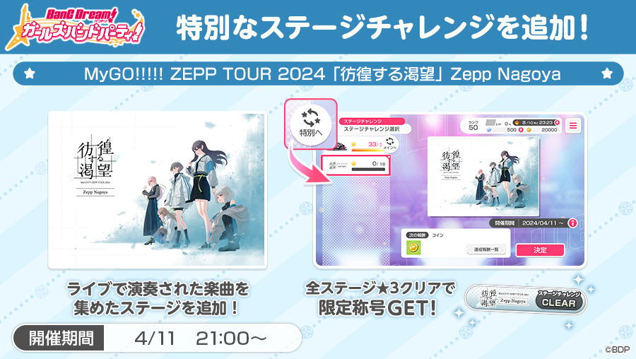 ライブで演奏した楽曲を集めた特別ステージが、「ガルパ」ステージチャレンジ機能に追加決定