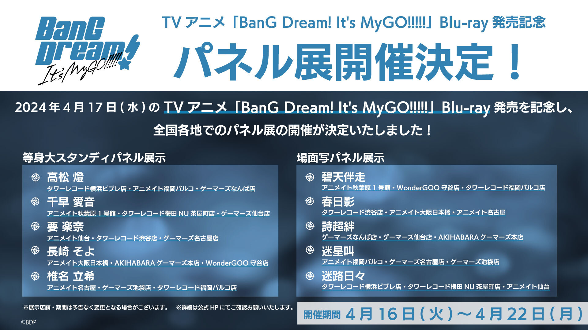 TVアニメ「BanG Dream! It's MyGO!!!!!」Blu-ray発売記念パネル展開催決定