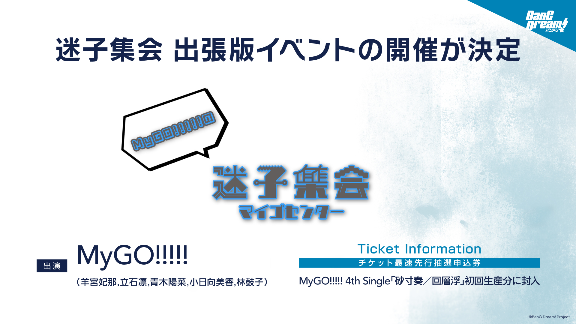 毎週水曜日19時に公開しているMyGO!!!!!によるラジオ番組「迷子集会」(読み:マイゴセンター)の出張版イベントの開催が決定しました。