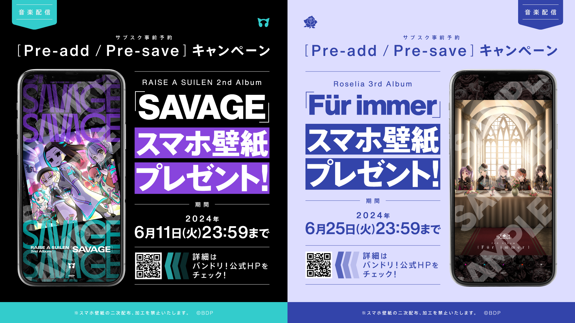 2024年6月12日(水) RAISE A SUILEN 2nd Album「SAVAGE」、6月26日(水) Roselia 3rd Album「Für immer」のリリースを記念して、サブスク事前予約(Pre-add / Pre-save)キャンペーンを実施いたします!