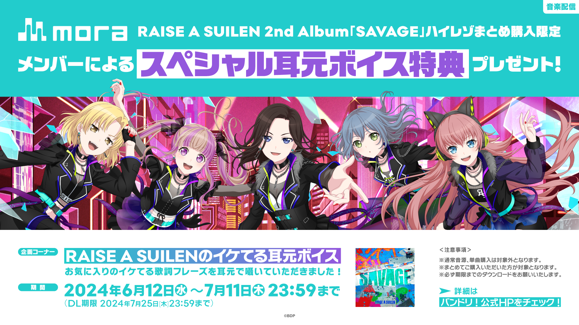 2024年6月12日(水) RAISE A SUILEN 2nd Album「SAVAGE」のリリースを記念して、moraハイレゾまとめ購入限定スペシャル耳元ボイス特典プレゼントキャンペーンを開催!