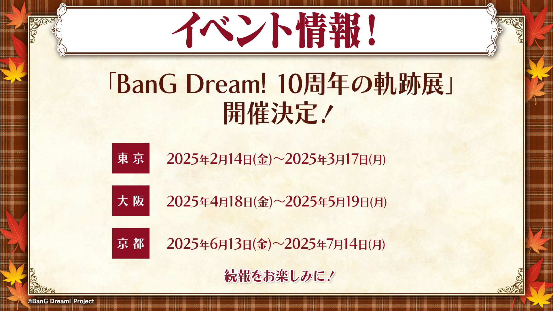 News 2024.10.17ライブ・イベント 「BanG Dream! 10周年の軌跡展」開催決定! 「BanG Dream! 10周年の軌跡展」開催決定 BanG Dream!10周年を記念して、「BanG Dream!10周年の軌跡展」の開催が決定!東京は2025年2月14日から3月17日まで開催予定で、その後4月に大阪・6月に京都へ巡回予定です。開催場所などの詳細情報は順次公開となりますので、続報をお楽しみに!! SHARE