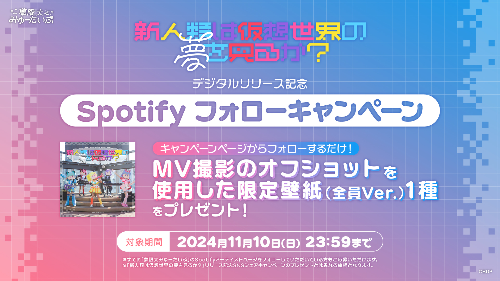 夢限大みゅーたいぷのSpotifyアーティストページをフォローするとMV撮影のオフショットを使用した壁紙が貰えるキャンペーンを開催中です。