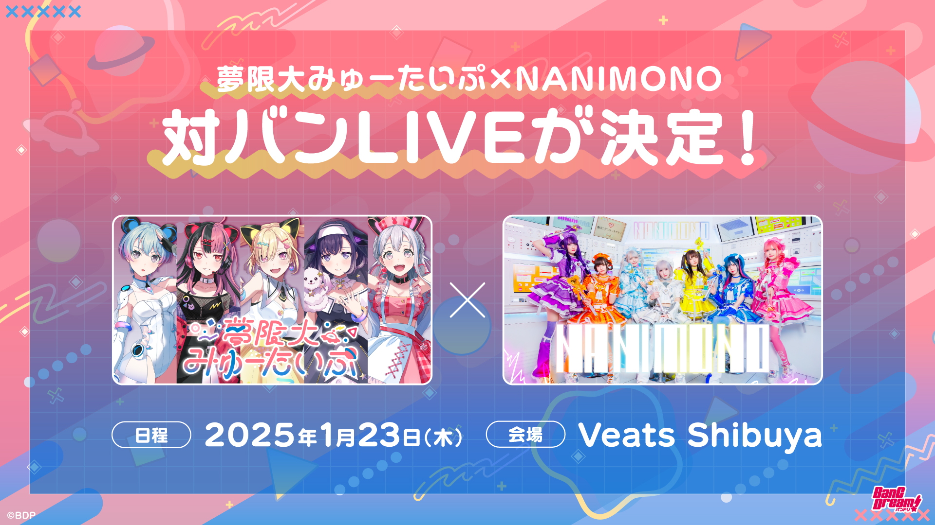 NANIMONO × 夢限大みゅーたいぷ 対バンLIVE『新人類は何者かになる夢を見るか?』が2025年1月23日(木)に開催決定となりました。