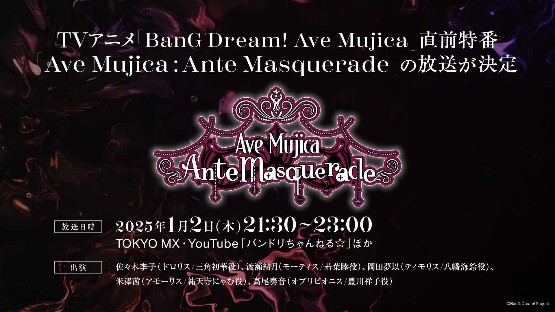 1月2日(木)21:30より、TOKYO MXやYouTube「バンドリちゃんねる☆」ほかにてアニメ放送直前特番「Ave Mujica: Ante Masquerade」の放送が決定いたしました。