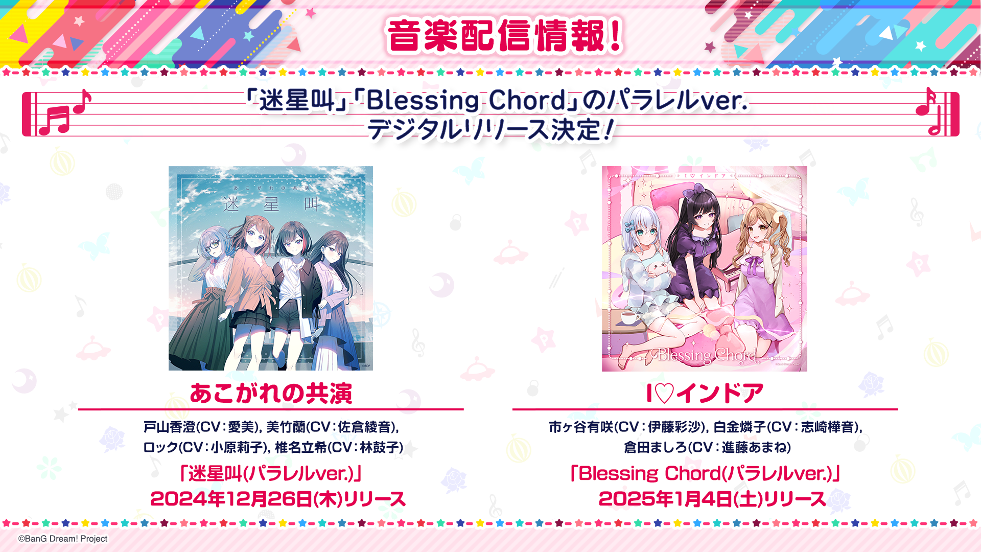 Poppin'Party・戸山香澄(CV:愛美)、Afterglow・美竹蘭(CV:佐倉綾音)、RAISE A SUILEN・ロック(CV:小原莉子)、MyGO!!!!!・椎名立希(CV:林鼓子)をボーカルに迎えた「あこがれの共演」が歌唱する「迷星叫(パラレルver.)」と、