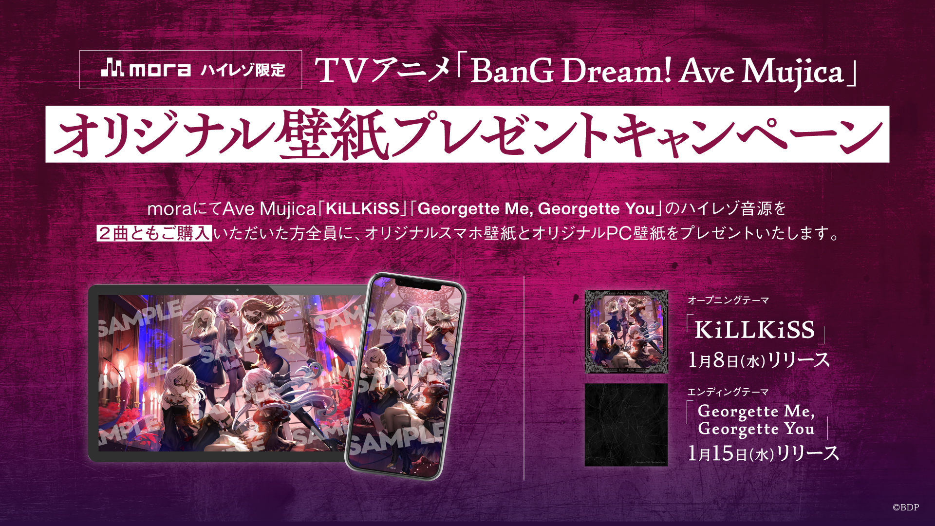 TVアニメ「BanG Dream! Ave Mujica」のオープニングテーマ「KiLLKiSS」とエンディングテーマ「Georgette Me, Georgette You」のハイレゾ音源を2曲ともご購入いただいた方限定で、オリジナルスマホ壁紙とオリジナルPC壁紙をプレゼントいたします。