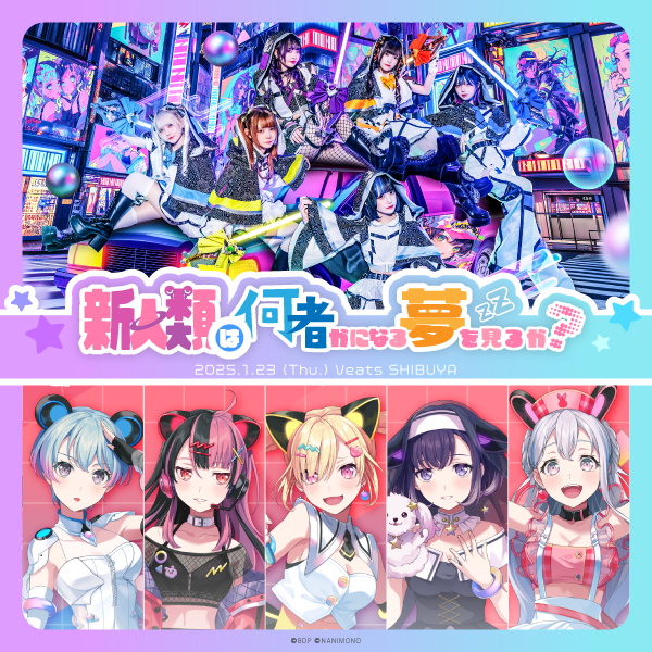 2025年1月23日(木)に開催したNANIMONO × 夢限大みゅーたいぷ 『新人類は何者かになる夢を見るか?』にて披露したセットリストのプレイリストを、各音楽配信サービスにて公開中です。