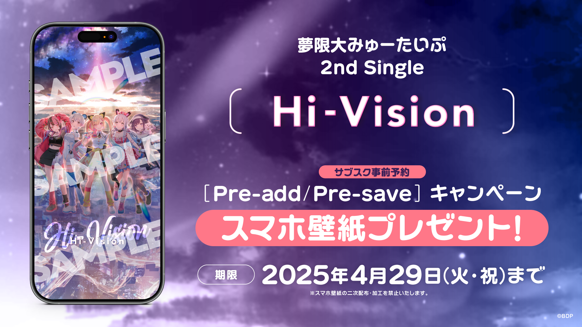夢限大みゅーたいぷ 2nd Single「Hi-Vision」のデジタルリリースを記念して、Apple Music・Spotify事前予約(Pre-add / Pre-save)キャンペーンを実施いたします。