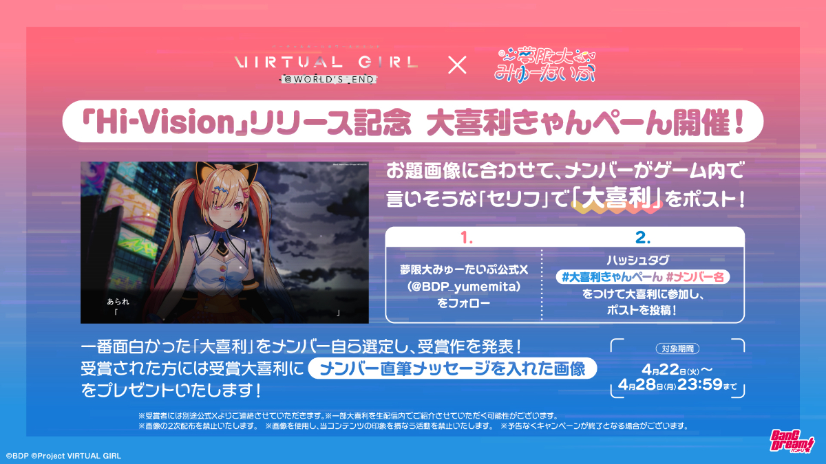 受賞者の方には夢限大みゅーたいぷ公式X(@BDP_yumemita)より、DMにてご連絡いたします。