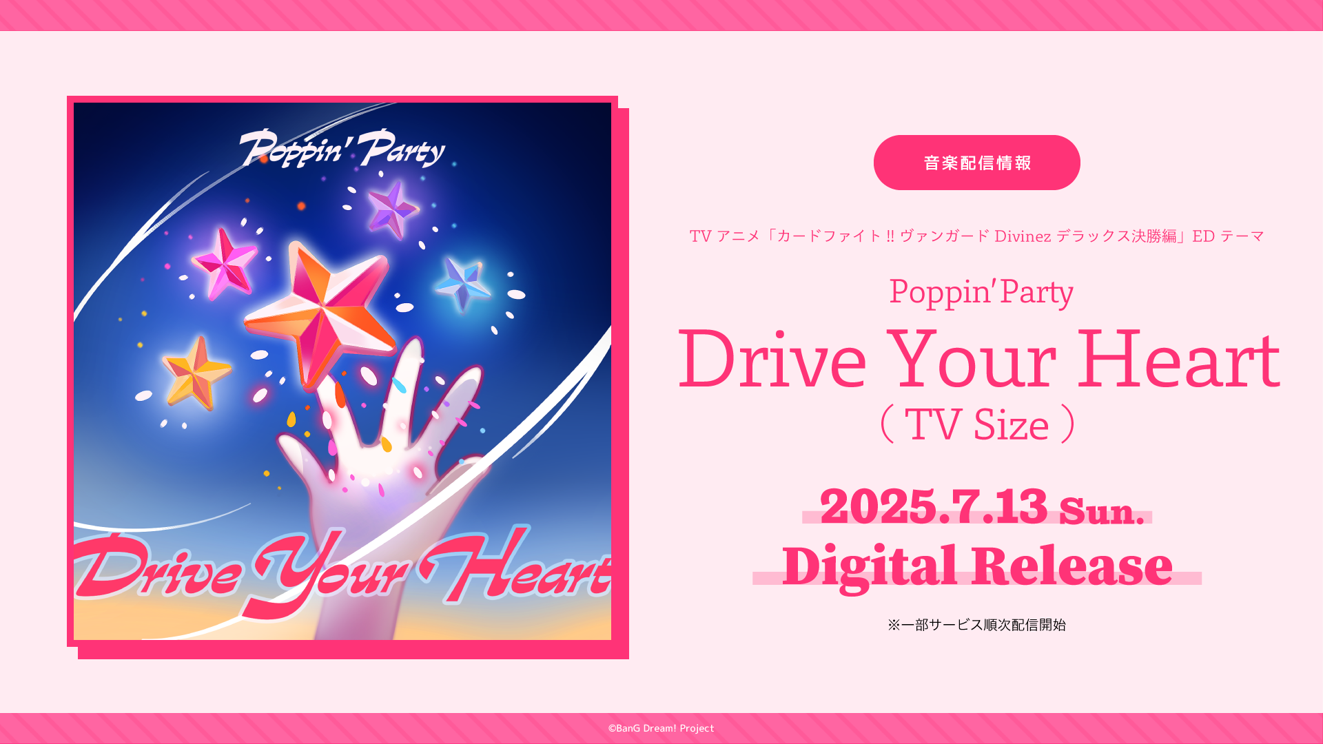 EDテーマ1曲目はPoppin'Partyの新曲「Drive Your Heart」。本楽曲がTV Sizeでデジタルリリース!