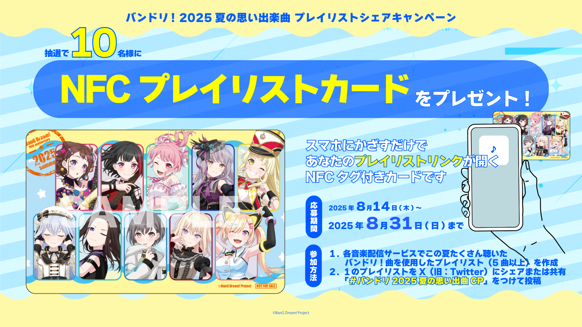 対象の音楽配信サービスでお好きなバンドリ!楽曲を5曲以上選び、プレイリストを作成、「#バンドリ2025夏の思い出曲CP」をつけてシェアしてくれた方の中から抽選で10名様に、オリジナルの「NFCプレイリストカード」をプレゼント!