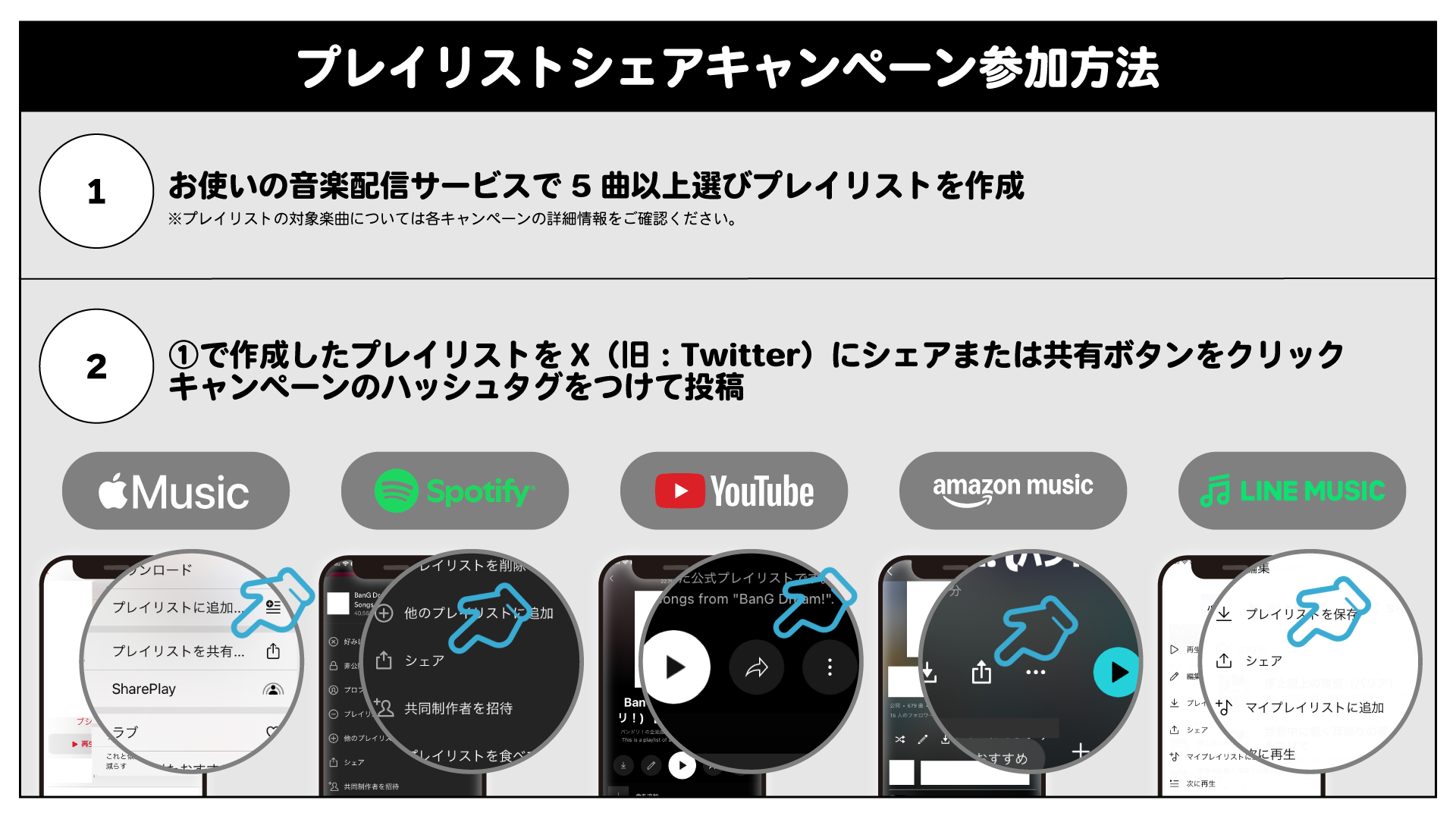 ①お使いの音楽配信サービスでバンドリ!楽曲5曲以上選びプレイリストを作成