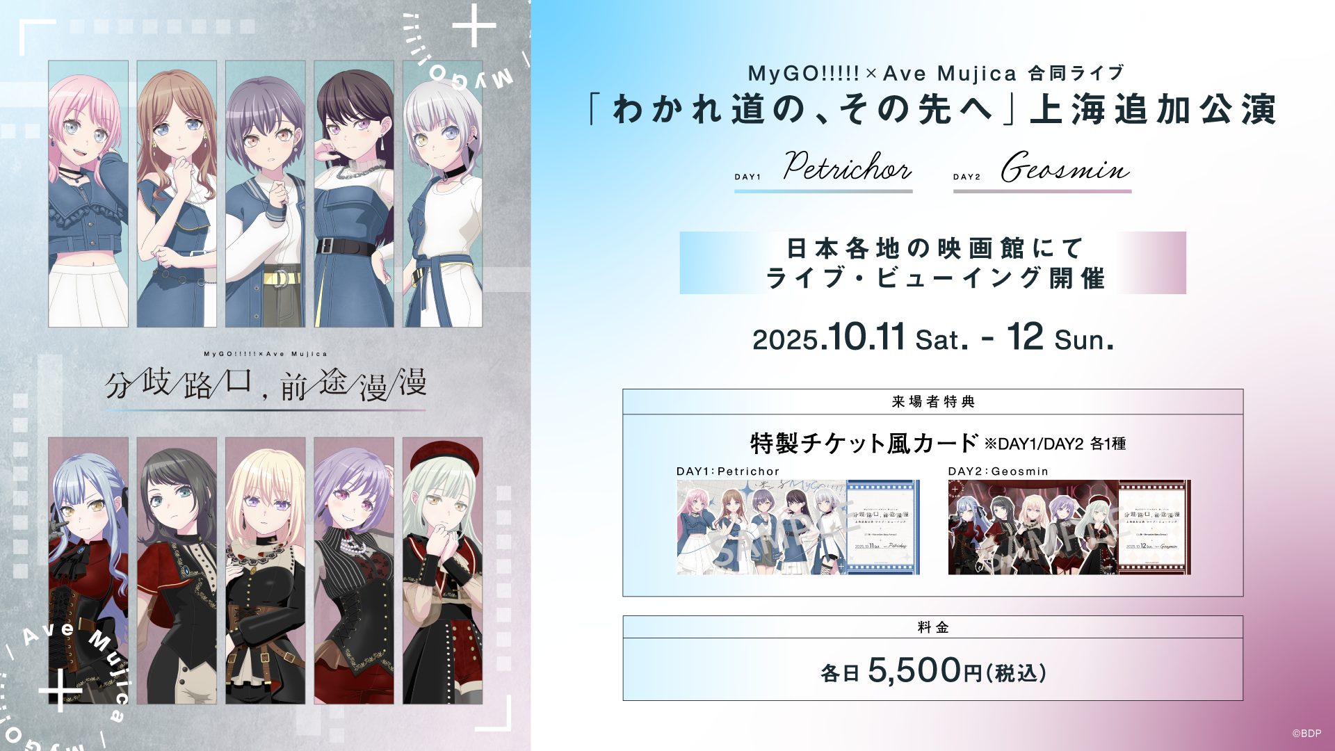 2025年10月11日(土)・12日(日)開催、MyGO!!!!!×Ave Mujica 合同ライブ「わかれ道の、その先へ」上海追加公演のライブ・ビューイングの実施が決定しました。
