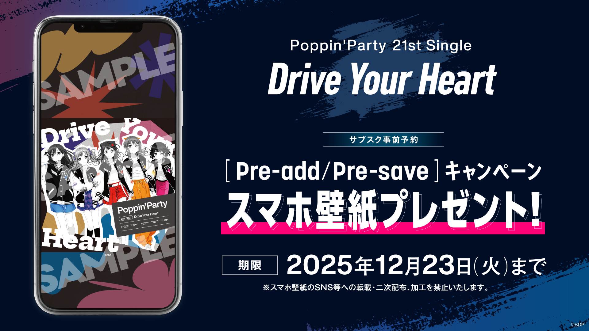 Poppin'Party 21st Single「Drive Your Heart」のデジタルリリースを記念して、Apple Music・Spotify事前予約(Pre-add / Pre-save)キャンペーンを実施いたします。