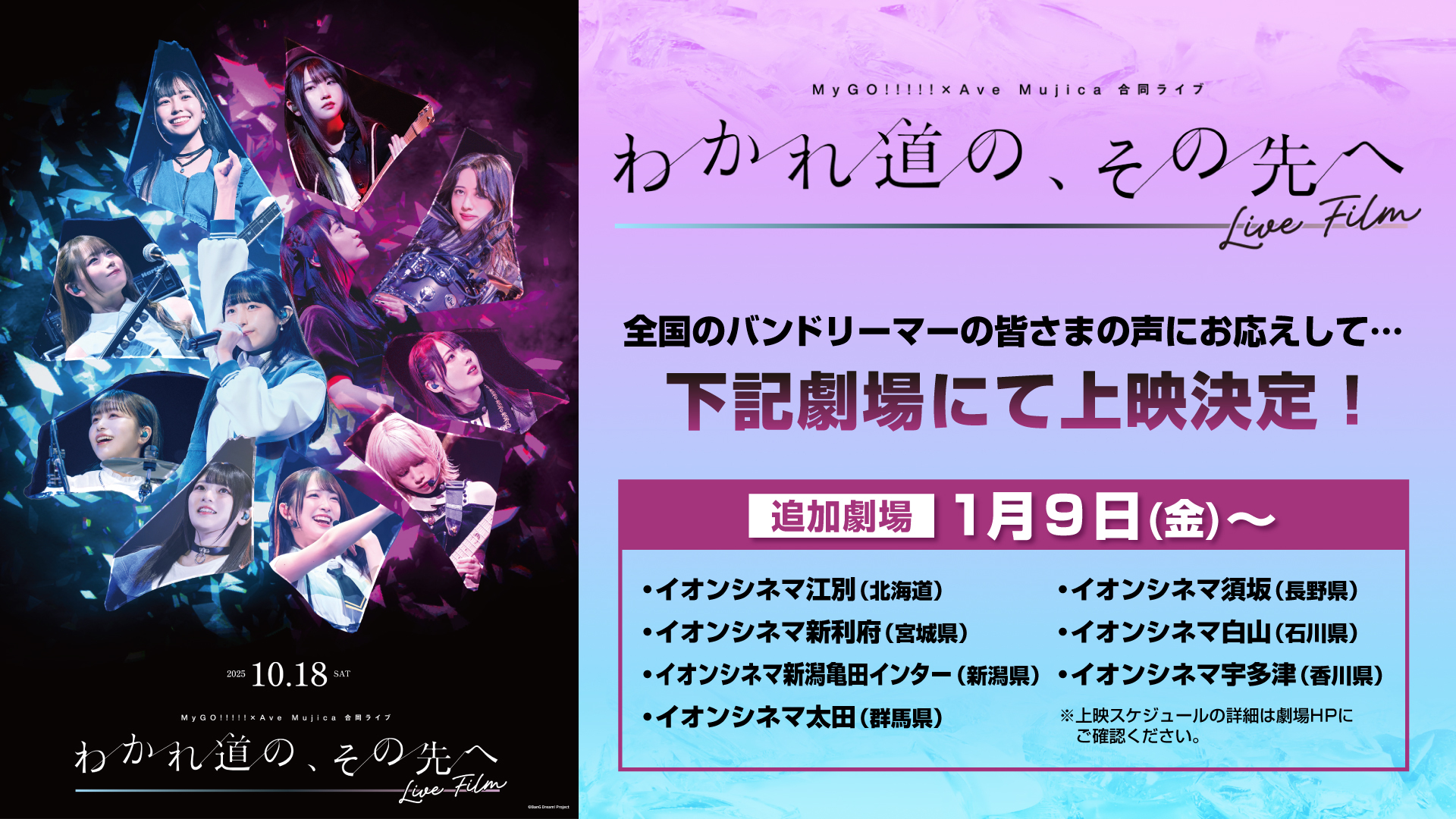 News 2025.12.18ライブ・イベント MyGO!!!!!×Ave Mujica 合同ライブ「わかれ道の、その先へ」 LIVE FILM 追加劇場での上映決定 『MyGO!!!!!×Ave Mujica 合同ライブ「わかれ道の、その先へ」 LIVE FILM』の追加劇場での上映が決定しました。 詳細はこちら:https://jiaolvsell.com/mygo_avemujica_livefilm SHARE 関連アーティスト MyGO!!!!! Ave Mujica