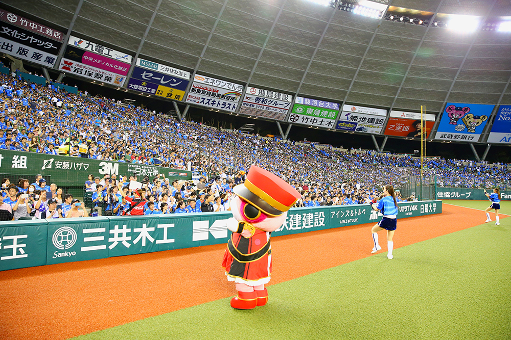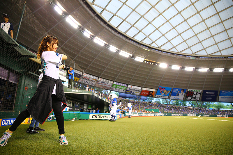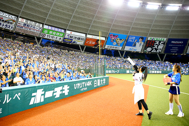 7回表終了時のラッキーセブンでは、公式パフォーマー「bluelegends(ブルーレジェンズ)」と一緒に、相羽あいなさん、工藤晴香さん、ミッシェルがグラウンド上から試合を盛り上げました。