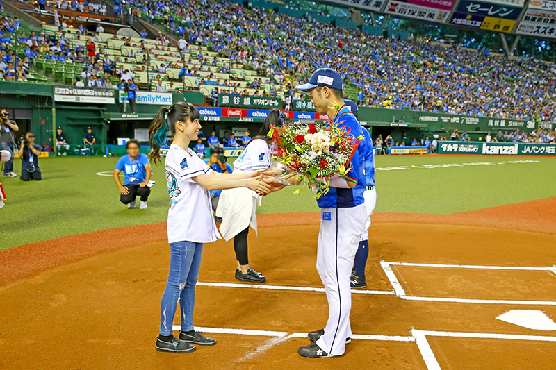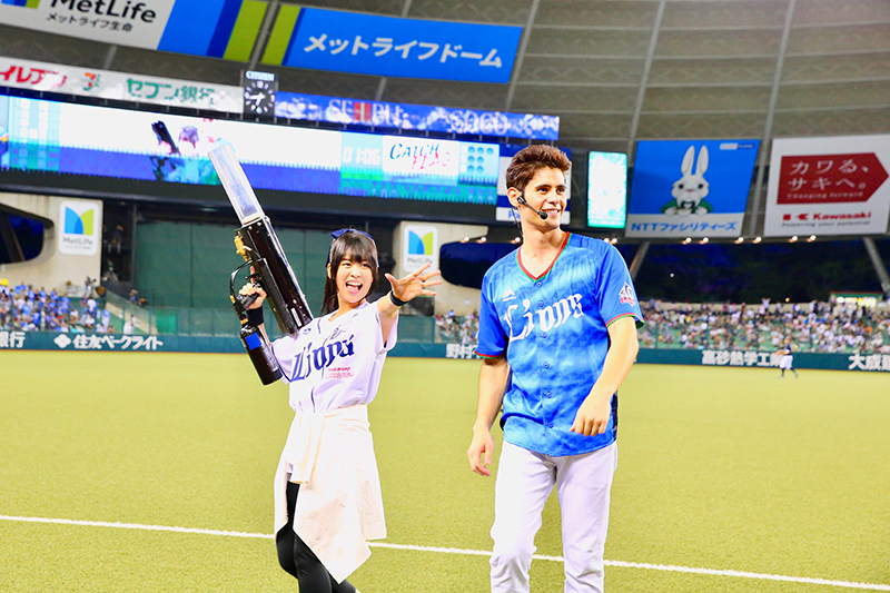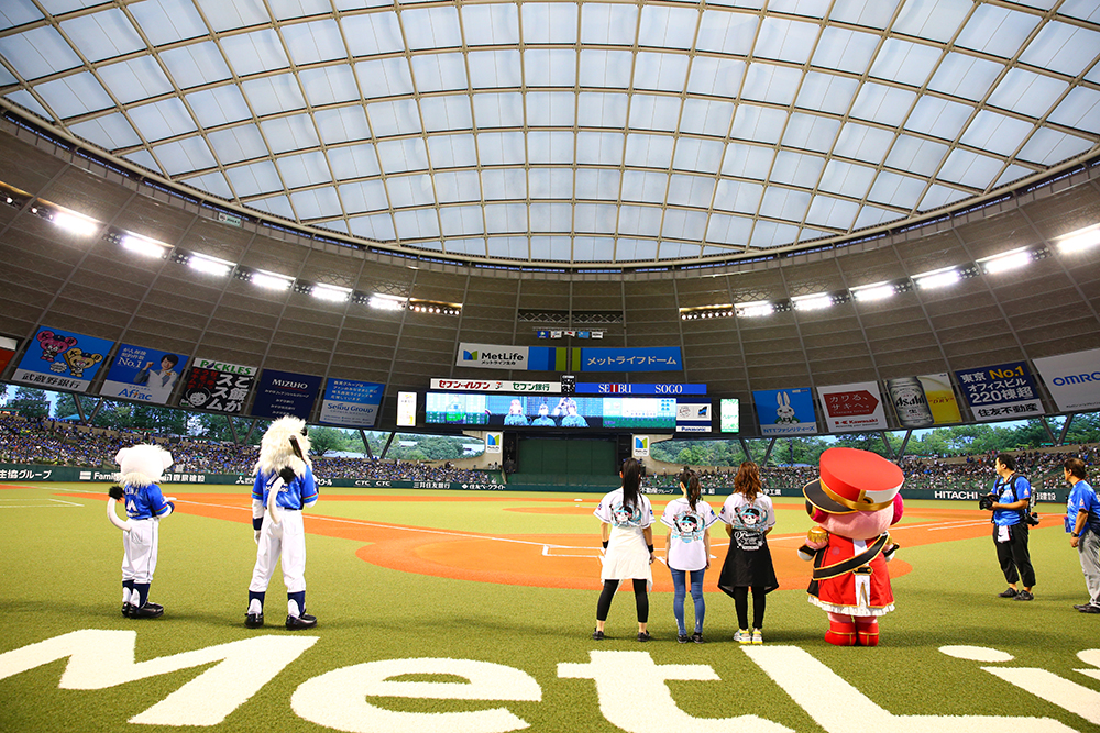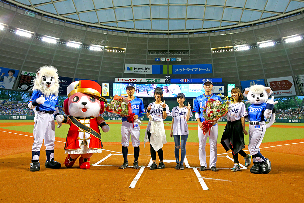 試合開始前、相羽あいなさん、工藤晴香さんから埼玉西武ライオンズの選手へ花束を贈呈。愛美さん、ミッシェルも登場して記念撮影しました。