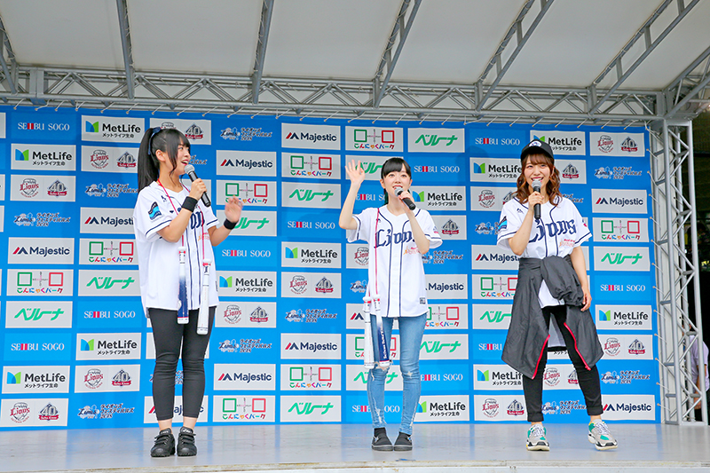 ドーム前広場のミニステージに、相羽あいなさん、工藤晴香さん、愛美さん、ミッシェルが登場。野球トークをしました。