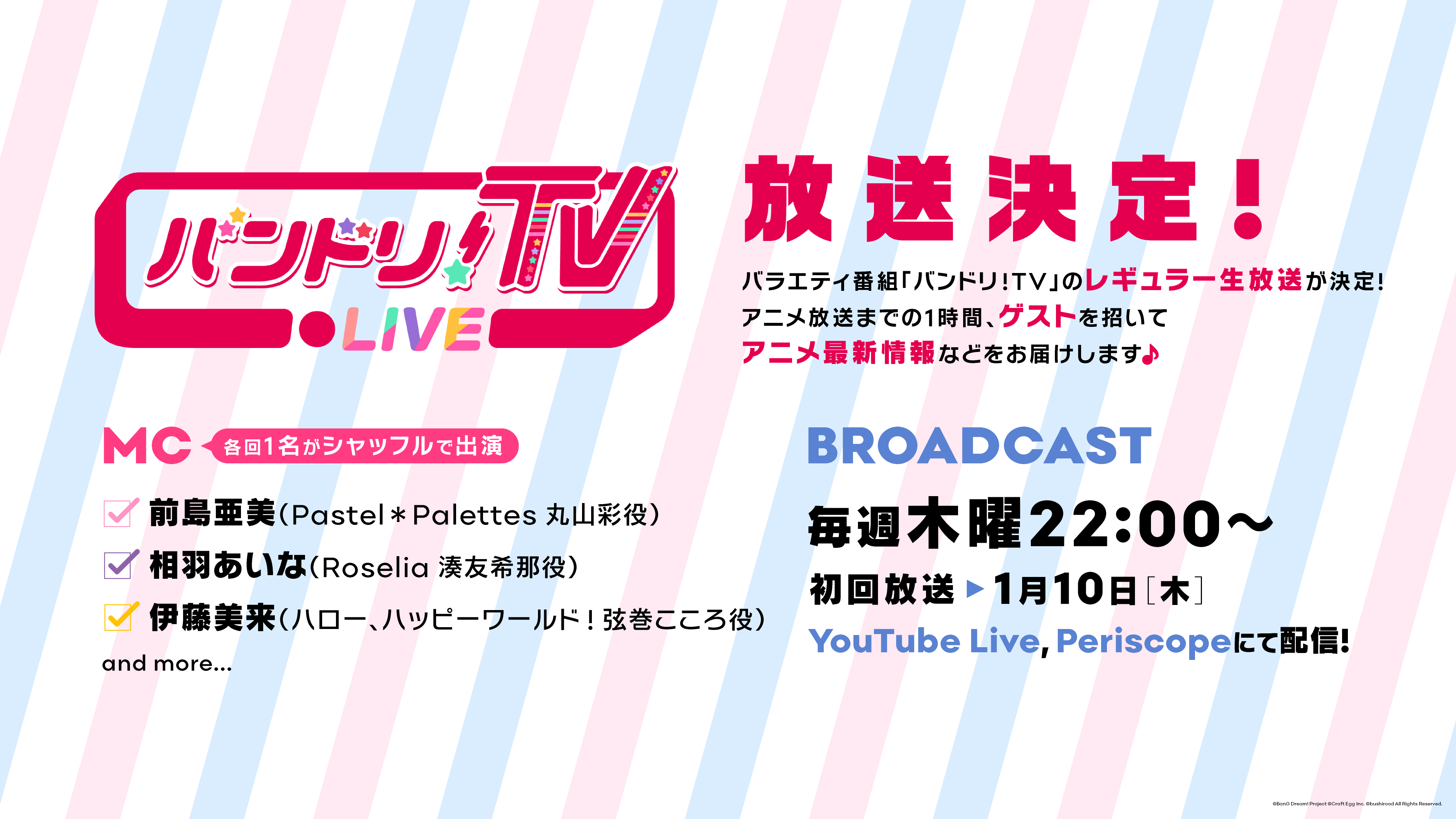 News 2018.12.12メディア 「バンドリ!TV LIVE」放送決定! 「バンドリ!TV」のレギュラー生放送が決定!アニメ「BanG Dream! 2nd Season」放送前の1時間、毎週ゲストを招いてアニメ最新情報などをお届けします。 SHARE