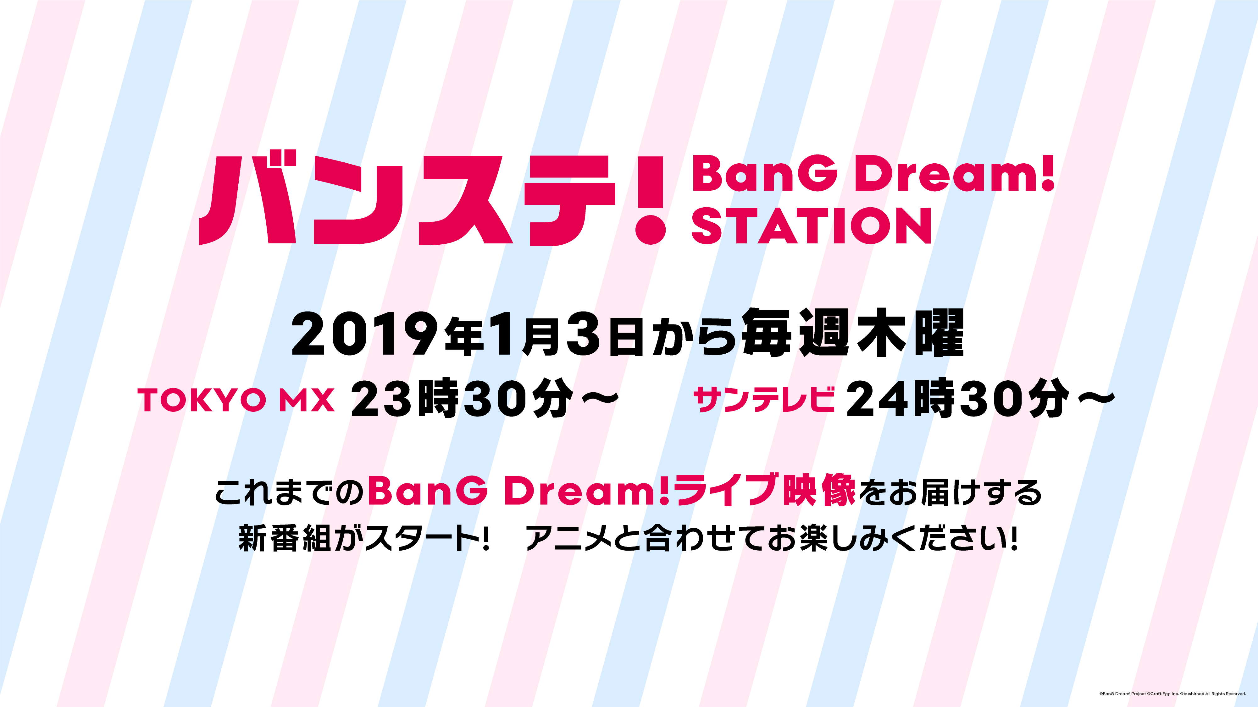 News 2018.12.12メディア 「バンステ! BanG Dream! STATION」放送決定! TOKYO MXにて、毎週アニメ「BanG Dream! 2nd Season」放送後に、「バンドリ!」のライブ映像をお届けする新番組を放送します。 SHARE
