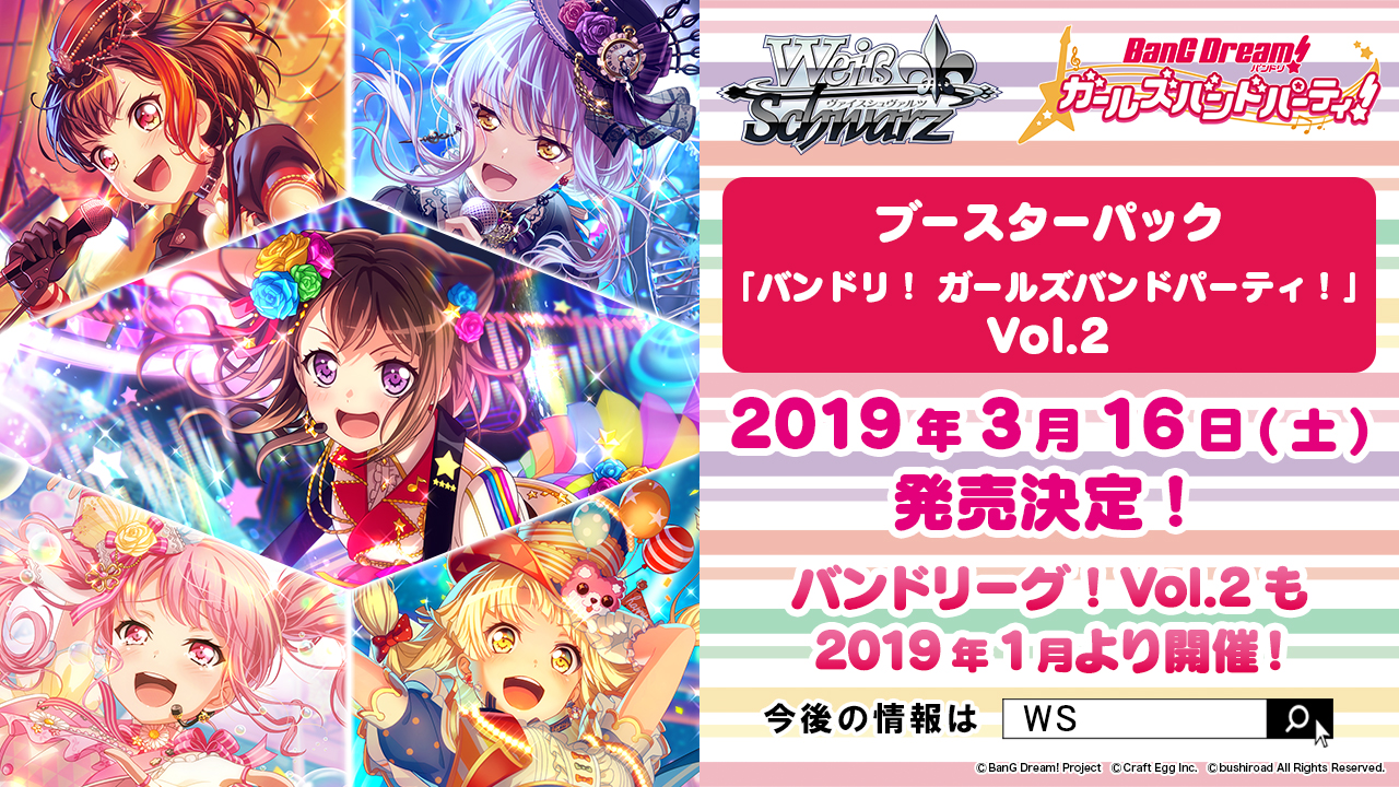 News 2019.01.08グッズ ヴァイスシュヴァルツ ブースターパック「バンドリ! ガールズバンドパーティ!」Vol.2発売決定! ヴァイスシュヴァルツ「バンドリ! ガールズバンドパーティ!」よりブースターパックvol.2が発売決定!ガルパ2周年を記念して、2周年当日の3月16日に発売です! 詳細はこちら! SHARE